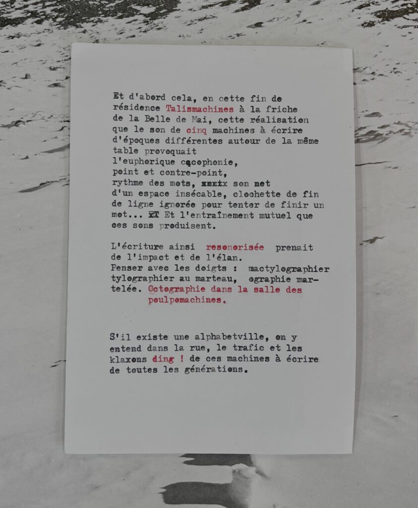 En décembre 2024, à l’invitation d’Alphabetville, Noam Assayag était en micro-résidence à la Friche la Belle de Mai à Marseille pour un projet de recherche et de création intitulé « TALISMACHINES », déclinant des démarches inscrites dans l’ouvrage Marcheur-Cueilleur : des règles de marche et cueillette dans la ville, des types d’écritures et de machines, d’usages d’objets et de mediums… Nos talismans.
